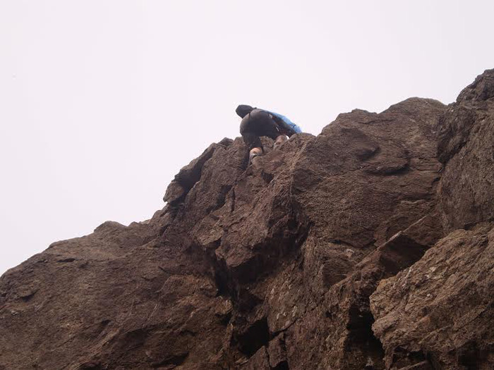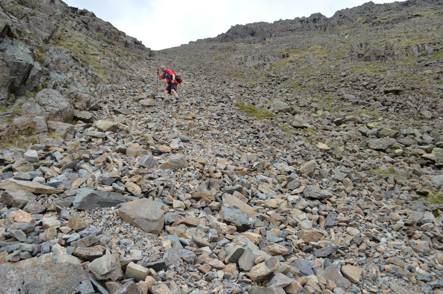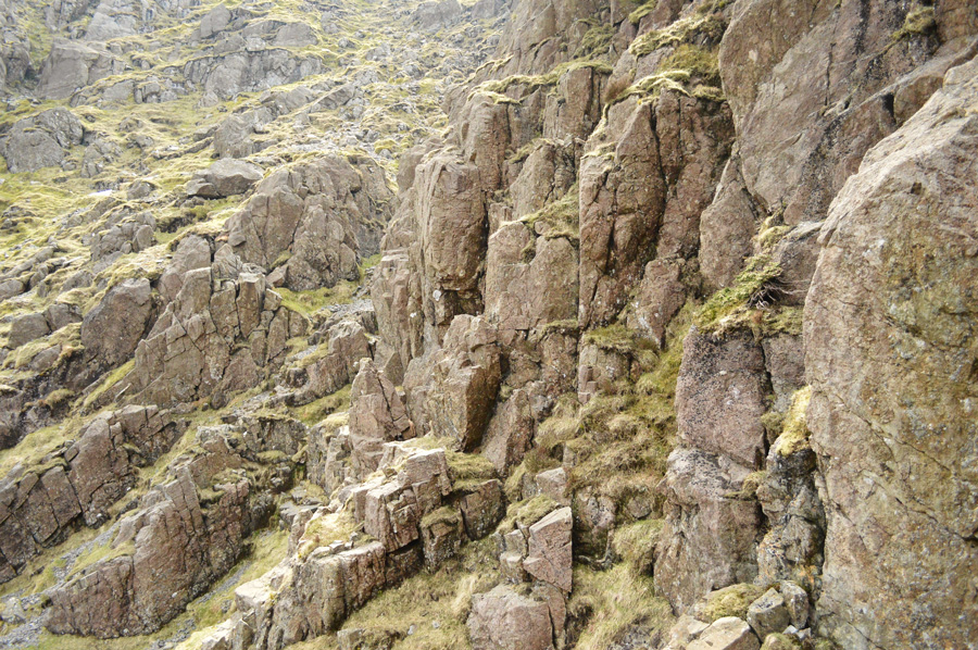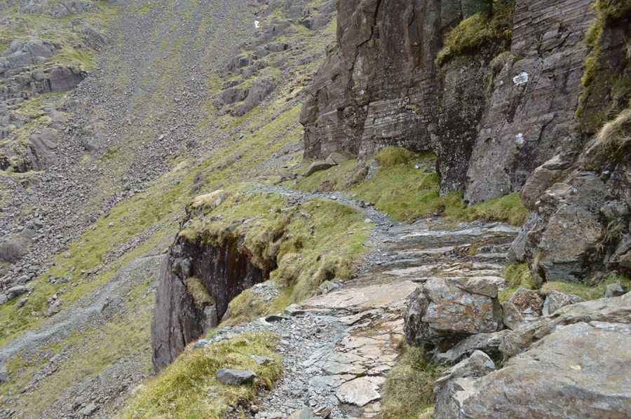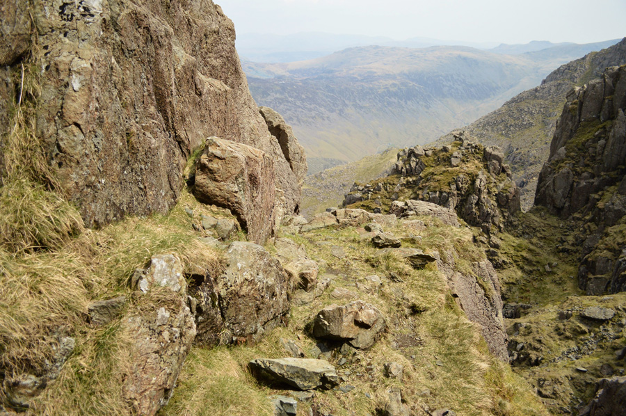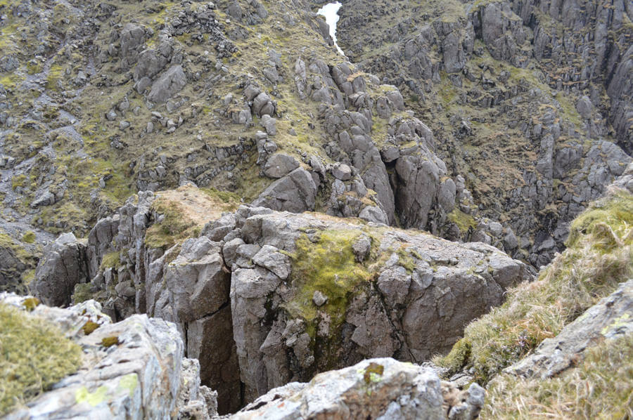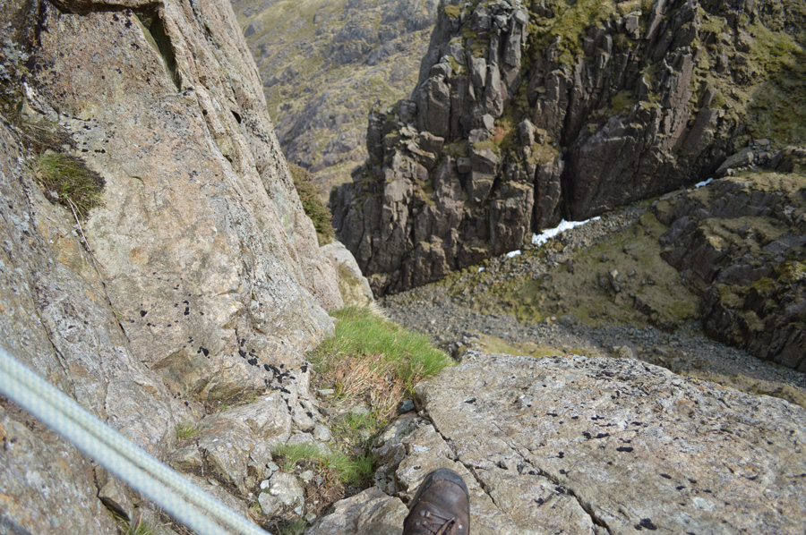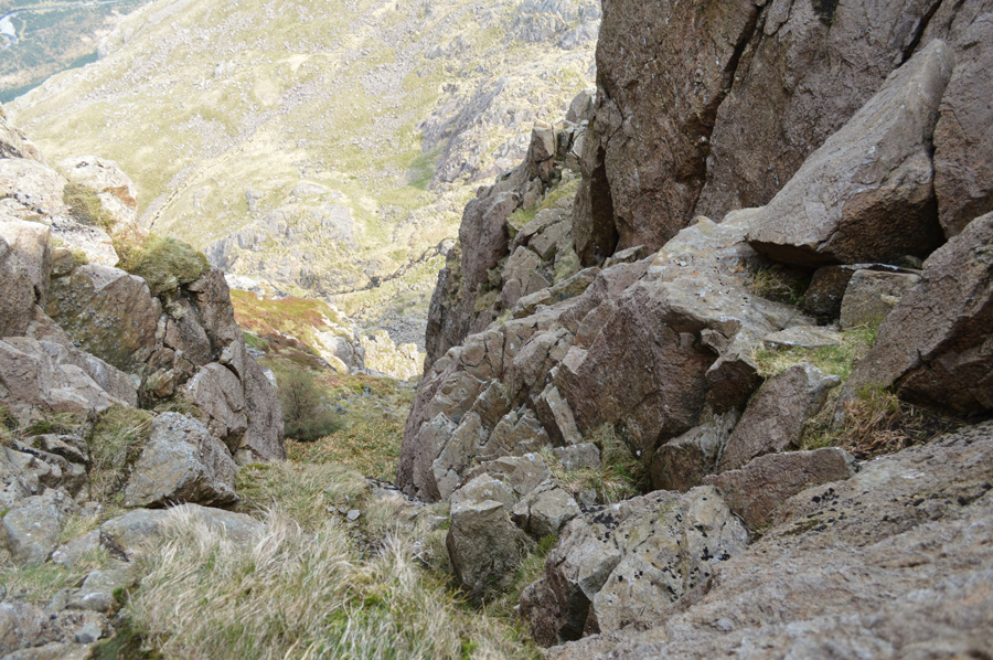 We had our first taste of roped scrambling whilst traversing the terrace path, it may not look it but some of those rocks are the size of small cars which had to negotiated with care. The Slab was reached via various four point contact scrambles, I was instructed to wait until Rod too had made the climb before continuing over the Slab on my backside picking out grooves with the edges of my boots which were etched into the stone Slab, Rod soon follows until we reach a rock ledge. |