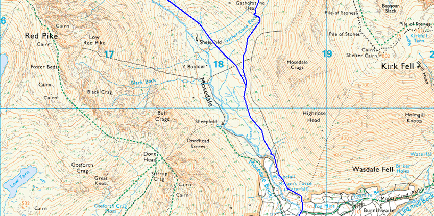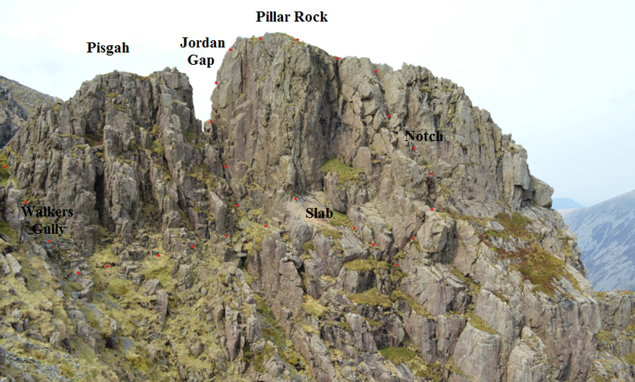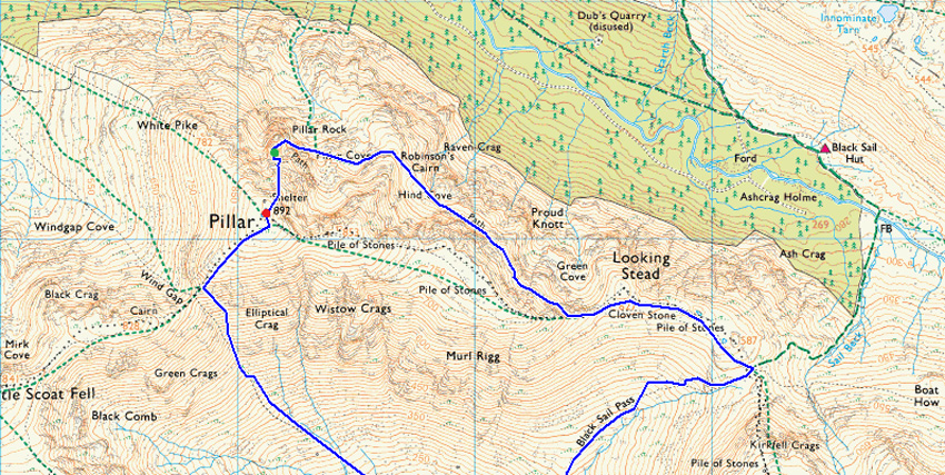 Wasdale Head – Mosedale Beck - Gatherstone Beck - Black Sail Pass – Looking Stead – High Level Route – Robinsons Cairn – Shamrock Traverse - The Slab - The Notch - Pillar Rock - Jordan Gap – Shamrock Traverse - Pillar – Wind Gap – Wind Gap Screes - Mosedale – Wasdale Head |