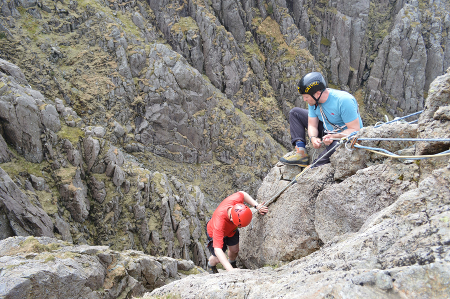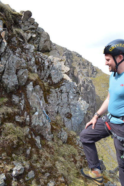 We continued our ascent along the Shamrock Traverse until a stone cairn was reached where we branched off right over a faint grassy trod towards the top of Walkers Gully. Having just traversed the High Level Route it was agreed we would stop for a bite to eat while Aled prepares kit. After a quick lunch we were eager to get kitted up which meant a lesson in how to attach the harness which is simply stepped into and adjusted at the side of the waste and the tops of both thighs, I asked Aled how tight the straps had to be as Aled smiled and replied "tight enough so you don't fall out of it" a laugh was shared but Aled's comment sunk in.