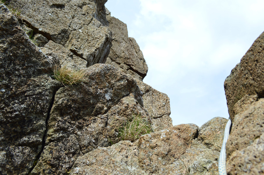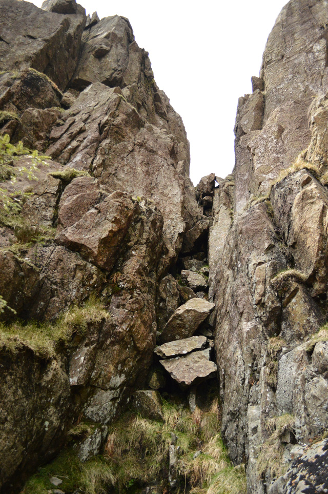With all three of us now in Jordan Gap all that remained was to descend via a rope scramble down Jordan Gap gully, with the rope re-attached we did this one by one. I went first followed by Rod and then Aled. From the base of the gully we found ourselves on familiar ground again in between the Slab and the grassy terrace, Walkers Gully was only a few moments away as we started to retrace our steps still roped up until the Gully was reached, just a few feet above our heads our packs are waiting and I for one could drink a gallon of water right now.