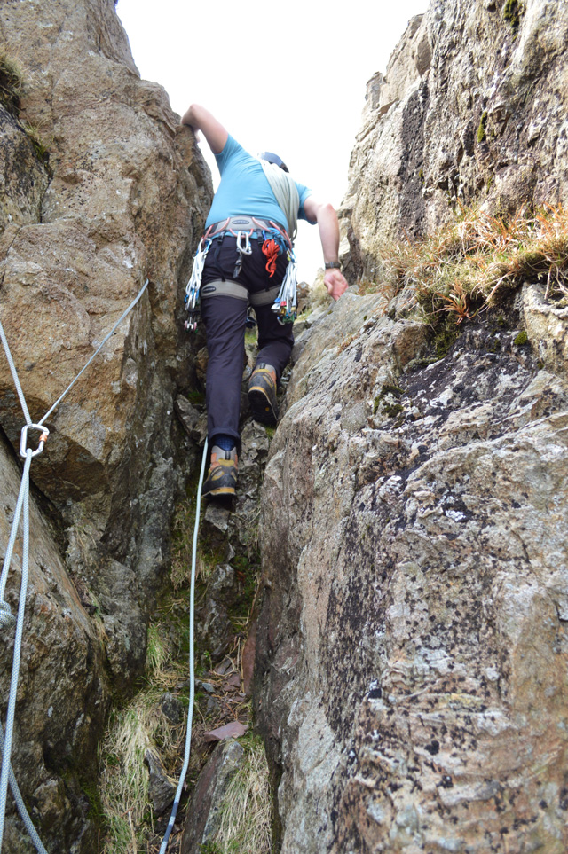 The ascent of the Notch was by far the best part of the climb so far, made so by the good scrambling via the almost vertical rocky buttresses seen in the right of the photo, all the while Aled belays both myself and Rod from the top of the Gully.
