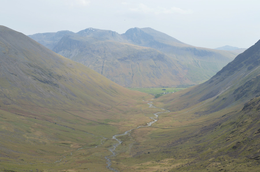 The morning air is warm and humid with the potential of it getting even hotter, it was agreed the night before that for the first time this year we would wear shorts which made for some unsightly white legs, especially on my behalf. After a final gear check we lock the cars and head out towards the Barn Door Shop passing the campsite and the Wasdale Head Inn before picking up the path alongside Mosedale Beck with views of Kirk Fell and the Mosedale Valley. |