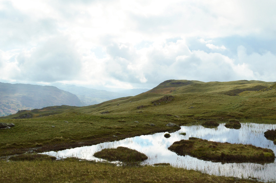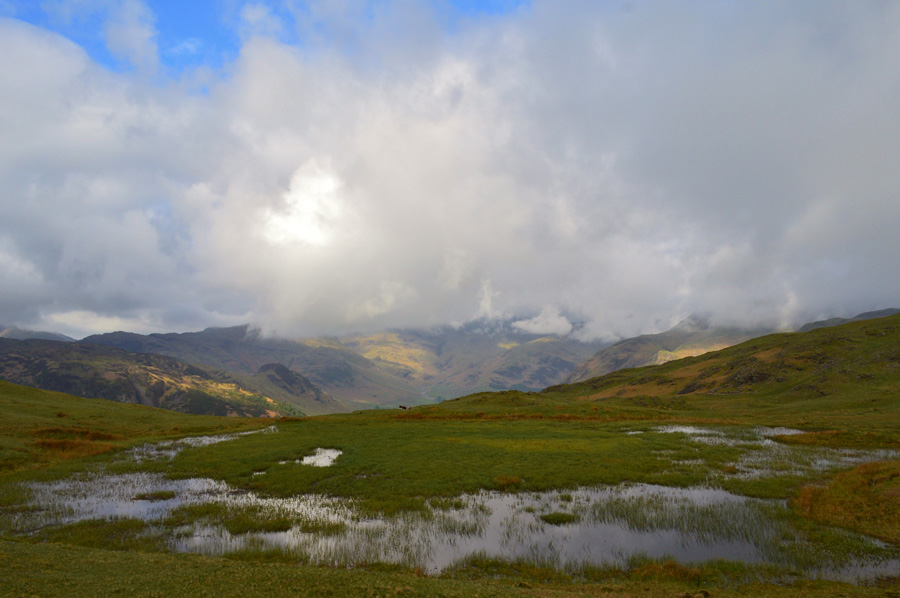 Cloud topped views of Crinkle Crags from Lang How Tarn. |