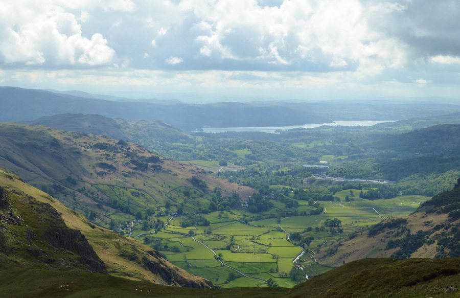 A distant Windermere seen over Great Langdale. |