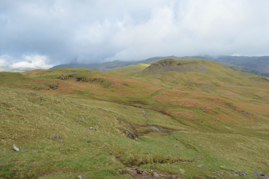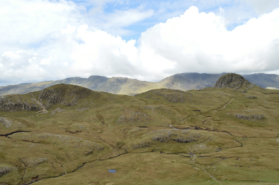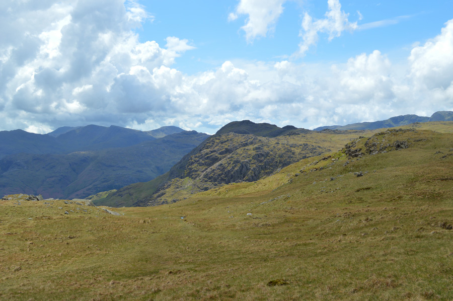 While beyond, Wetherlam and the Coniston Fells as I traverse below Raw Pike. |