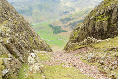 Descending Harrison Stickle with views over Harrison Combe, Loft Crag and Pike O'Stickle. |