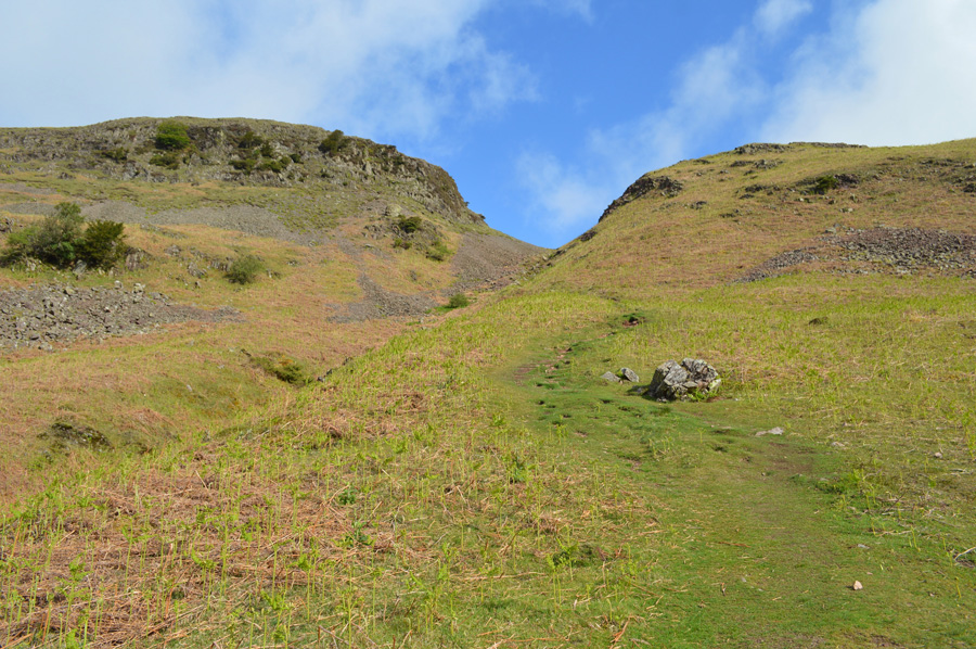 I don't mind admitting due to this being my first visit using this way of ascent I wasn't quite sure when the summit path would break away from the path which skirts around the lower flanks of the fell side, although after studying my map the evening before I was on the look out for some type of Gyll or Gully which soon presented itself as this grassy Ravine which separates the summit on the left from the bulk of the fell side on the right, it's a pretty steep haul helped by a good path underfoot which changes from grass to stone further into the ascent and with hardly a false summit insight, it's pretty direct too. |