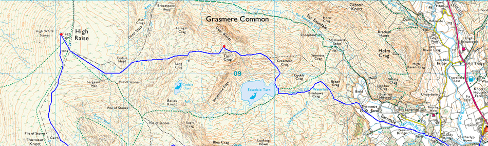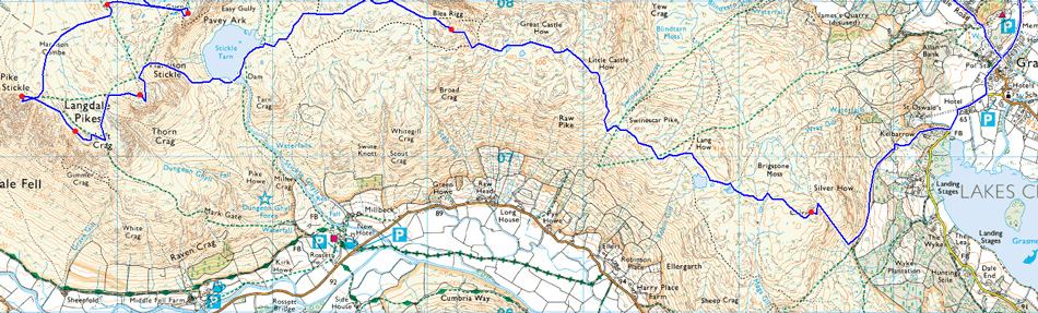 Grasmere - Kelbarrow - Silver How - Lang How Tarn - Blea Rigg - Stickle Tarn - Harrison Stickle - Harrison Combe - Loft Crag - Pike O'Stickle - Harrison Combe - Thunacar Knott - Pavey Ark - High Raise (Langdale) - Codale Head - Lang Crag - Tarn Crag (Easedale) - Easedale Tarn - Sourmilk Gill - Goody Bridge - Easdale Road - Grasmere |