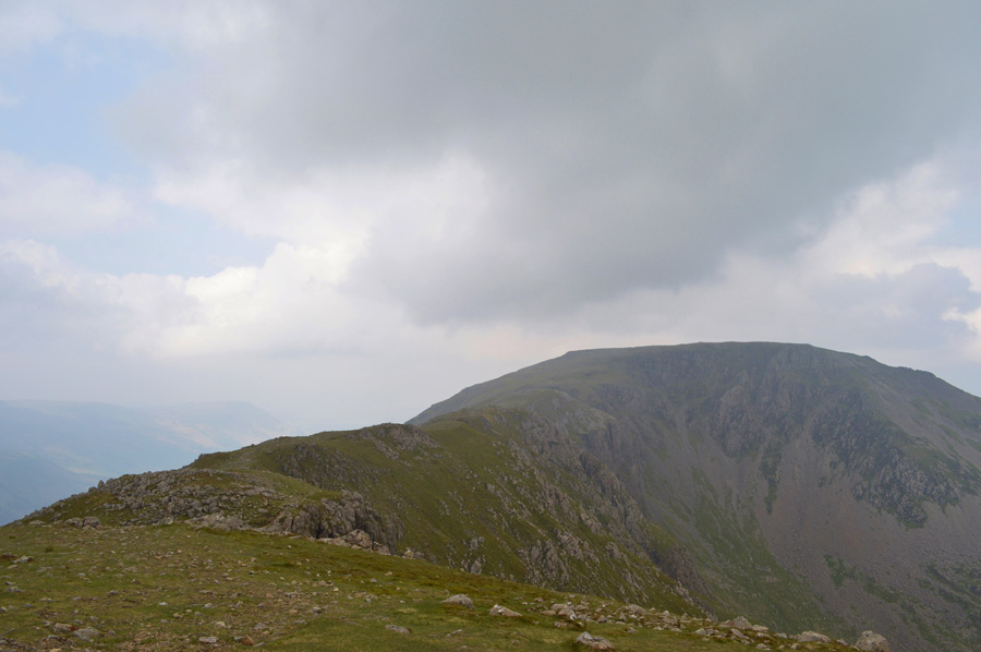 The summit commands a glorious view of mountainous country, a deserved reward for it is neither easily attained nor easily left, its defence of battlemented crags and hostile stones being breached only by the narrow ridge connected with High Stile, a mountain with difficulties of its own.