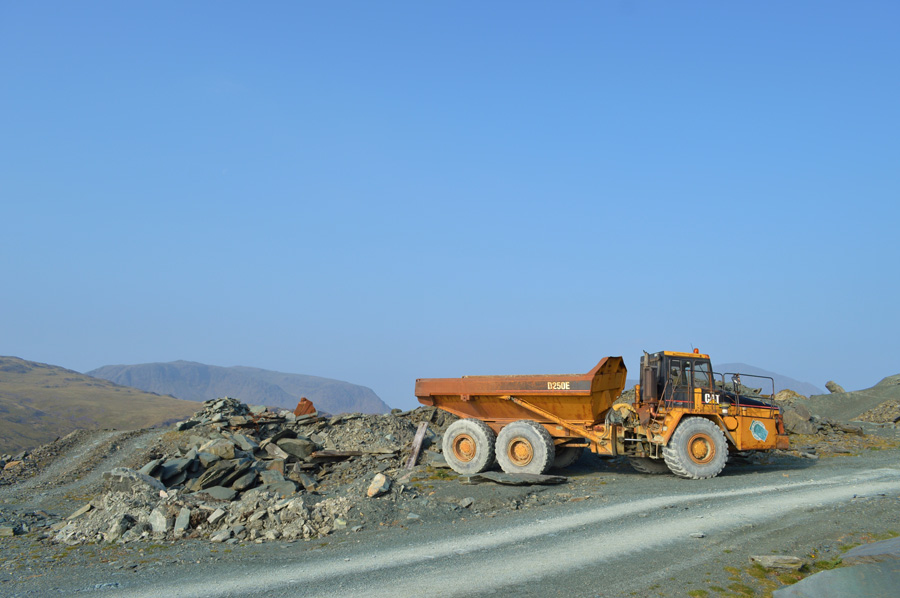 We had soon reached Honister Mine by which time the morning air was starting to get warm and indeed very muggy causing the body to over heat almost from the start. We walked through the visitor car park and was surprised to see it so empty, especially on a weekend with a good forecast set to last well into next week. Leaving the car-park behind we picked up the dusty road which rises steadily, then steeply through zig-zags first towards the Via Ferrata tour which would continue straight ahead, here we hook a left towards the spoil heaps from where a hazy view opened out over the Gables, Kirk Fell and the High Stile ridge, most of which was difficult to define as the haze was so thick, oh well, if this haze doesn't lift soon photography today is going to kept pretty limited. |