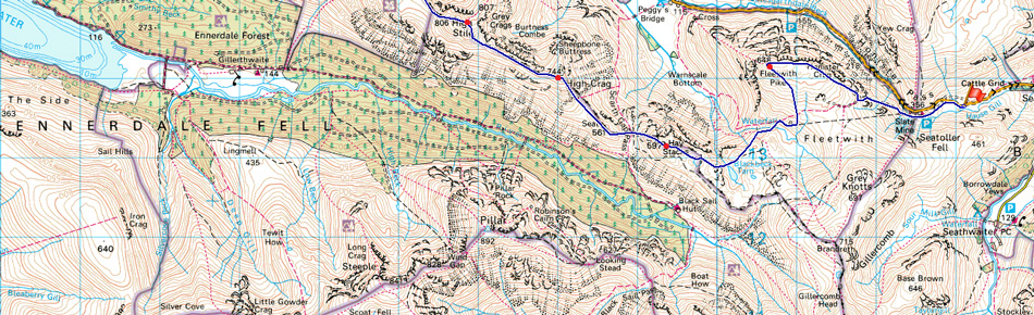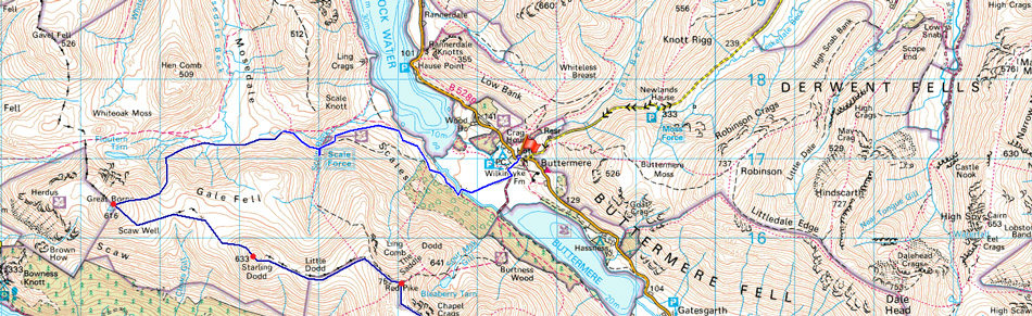 Top of Honister Pass - Honister Mines - Fleetwith Pike - Dubs Bottom - Blackbeck Tarn - Innominate Tarn - Hay Stacks - Top of Scarth Gap Pass - Seat - Gamlin End - High Crag - High Stile - Red Pike (Buttermere) - Little Dodd - Starling Dodd - Great Borne - Top of Red Gill - Whiteoak Moss - Scales Force - Buttermere Dubbs - The Fish Inn, Buttermere