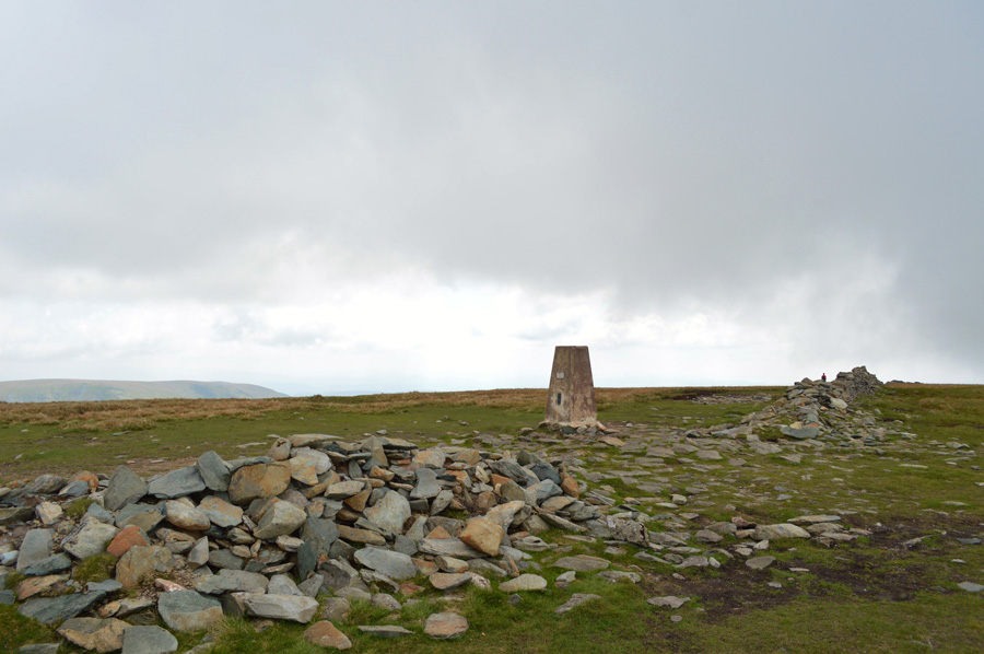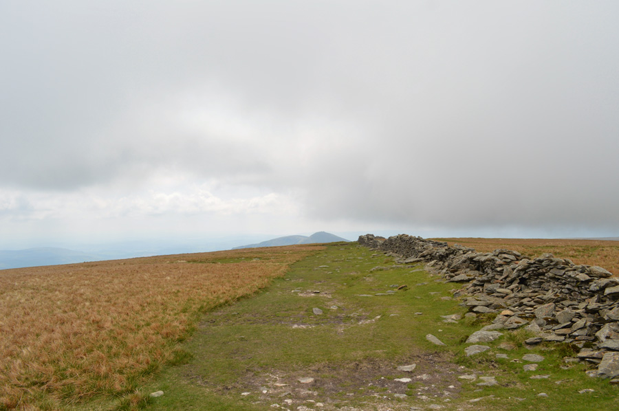 Behind the summit wall a small shelter large enough for one, or maybe two people had been fashioned from the stone wall which I must admit, made a good shelter from the summit cross winds which initially I didn't feel but soon finger tips and the bottom of my ears told me differently. From my sitting down position I hadn't noticed the cloud roll in as it clung to what felt like a hands length about my head, while beyond towards Helvellyn the views that I had seen minutes earlier had gone beneath a wall of cloud and haze.