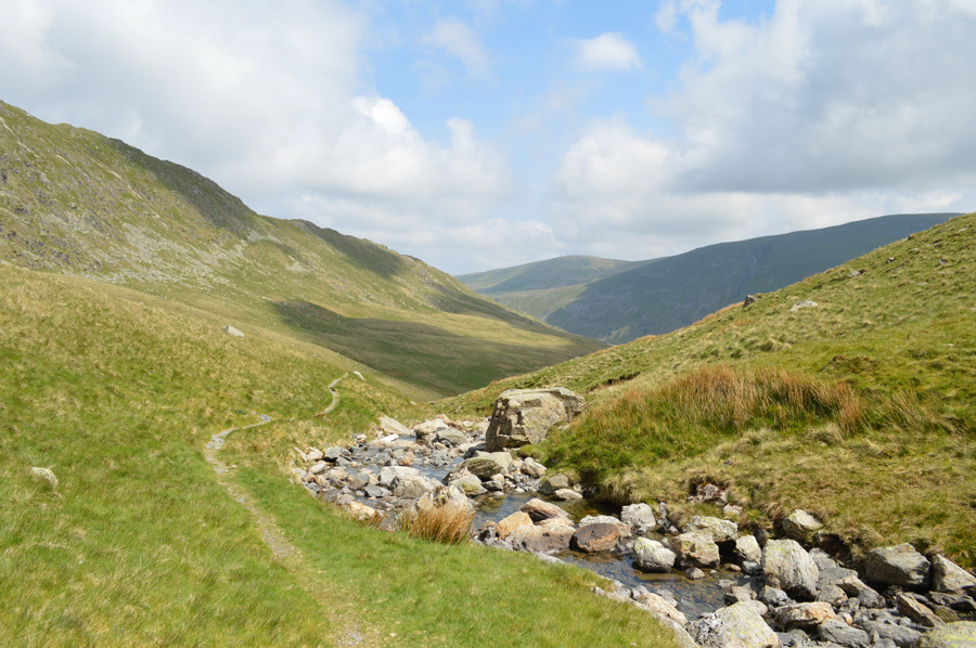 The path is singular and dry underfoot but this isn't the case once Blea Water Beck falls further away, here the path although widens becomes quite boggy and even after days without rain, retains the water well. |