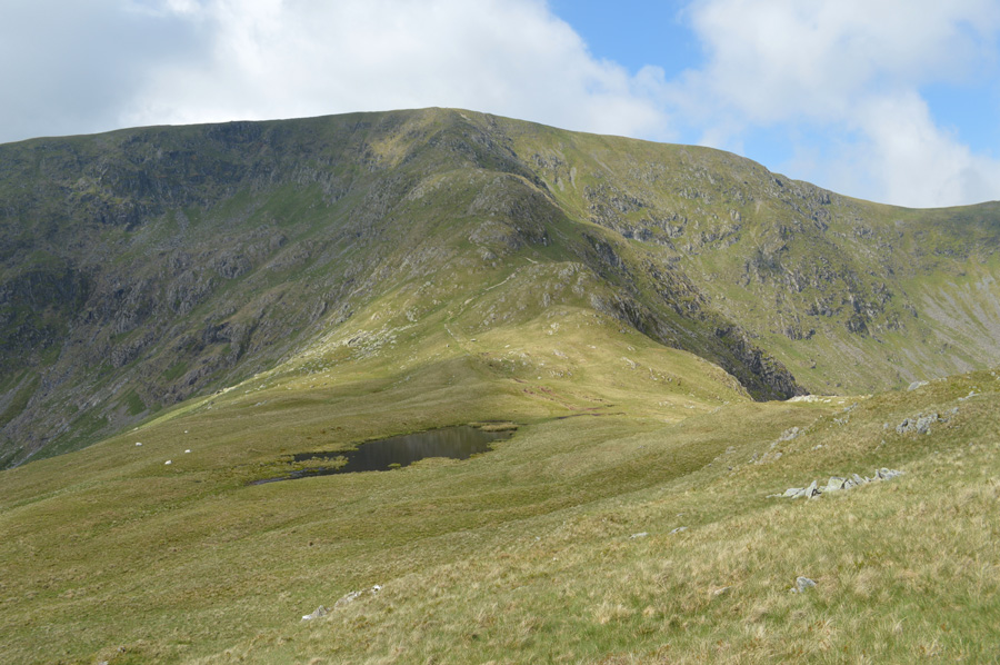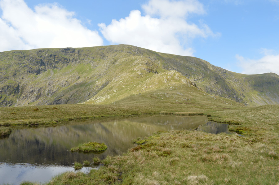 It hadn't rained for the past week and the ridge crossing reflected this by the dried out bogs and wild grasses found along the ridge. The area around the Tarn can get too boggy soaking up boots to the laces but not today the ground was dry and firm underfoot. Ahead is Long Stile which is the last section of the ridge to be climbed before reaching the summit, soon after leaving the Tarn behind the summit disappears behind the first and second craggy outcrops which make up Long Stile before the last and final push towards the summit which is found after a short but pleasant walk across the summit plateau. |