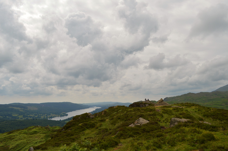 It was like someone had turned the light on by the time we reached Loughrigg Terrace as the grey morning cloud slowly melted into a haze of pastoral blues, views over Grasmere were still limited with the higher summits still under cloud which would soon burn away. Our path rises steadily leaving us no time to admire the views, instead we got stuck into the ascent trying to take advantage of what was left of the cool air which was rapidly warming up and with no wind whatsoever, just ten minutes into our first family summit of the day, we already found ourselves stopping to wipe sweated brows. |