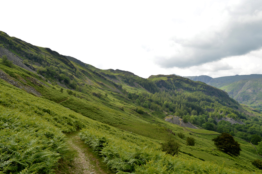 The sun by now was beating down and once again the humidity was stifling but we persevered along the farm track that at times seemed never ending, I kept an open eye out for the zig-zag path that would launch us up towards the quarries which was hidden between the Bracken. With Dale Head Farm reached our path onto open fell side soon opened up ahead passing a few walkers in descent as we steadily began the ascent on our last summit of the day.