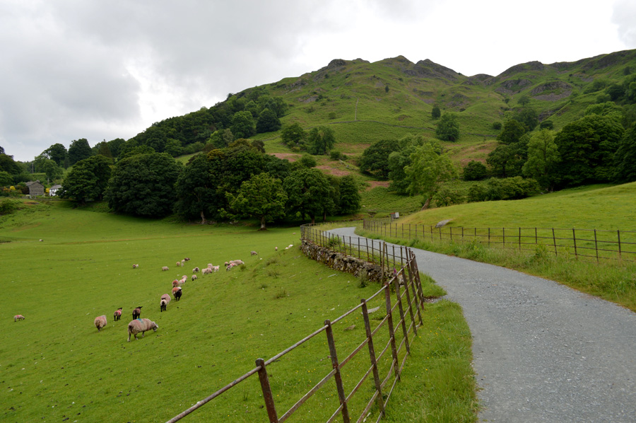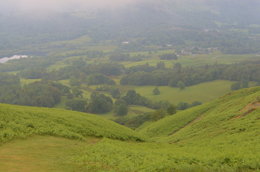 Soon the leafy Coppice is left behind in favour of open fell side, it's still quite murky and hazy but our views open out over Lingmoor Fell and the Langdale Pikes beyond. Park Farm is reached where we are greeted by three residents of one of the barns that has since been converted into Holiday homes, ahead we could see through the trees the traffic travelling along the A593 which by now was just a short distance by track away.