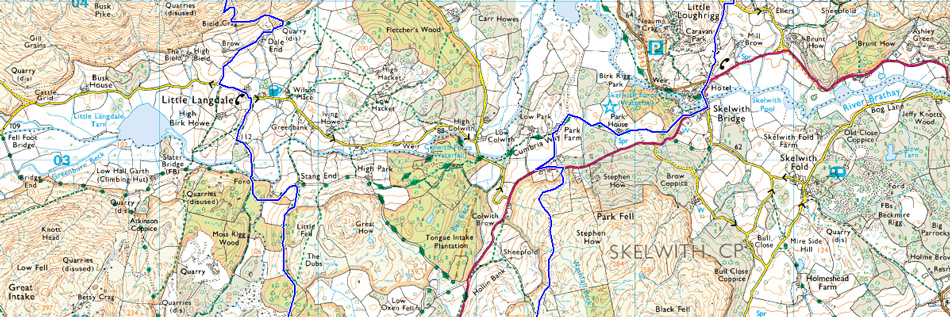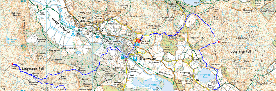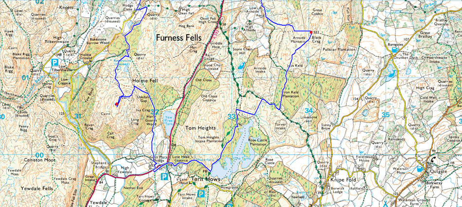 Walthwaite Bottom - High Close - Loughrigg Terrace - Loughrigg Fell - Loughrigg Tarn - Skelwith Bridge - A593 - Park Farm - Low Arnside - Black Crag - Arnside Plantation - Iron Keld Plantation - Tarn Hows - Glen Mary Bridge - Harry Gaurds Wood - Uskdale Gap - Holme Fell - Holme Ground - Hodge Close - Little Langdale - Dale End - Lingmoor Quarry - Lingmoor Fell - Lingmoor Quarry - Baysbrown Woods - Sawreys Woods - Burlington Quarry - Elterwater - Walthwaite Bottom |