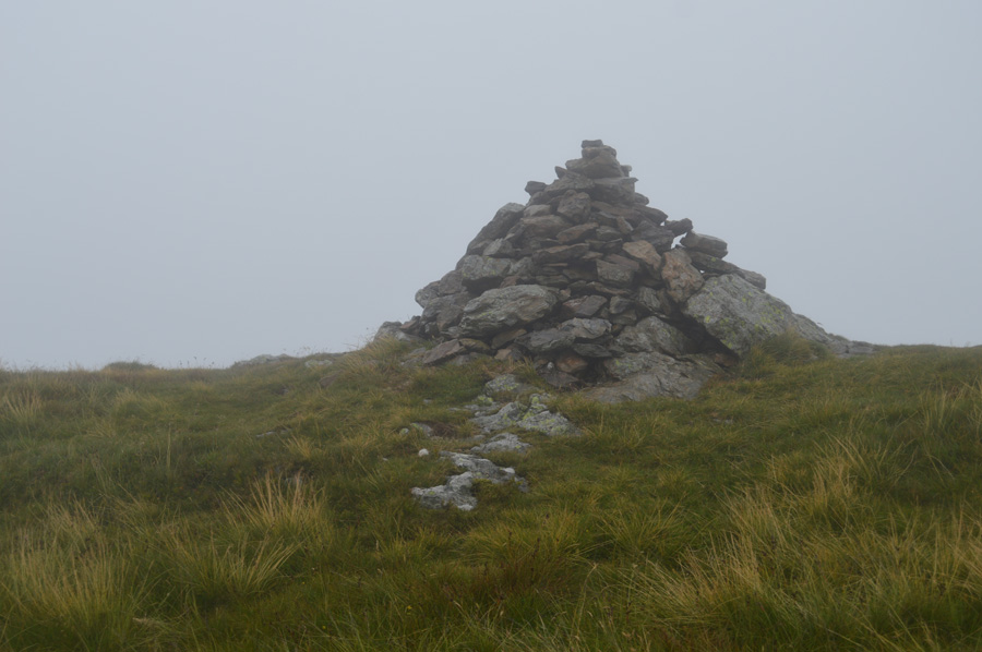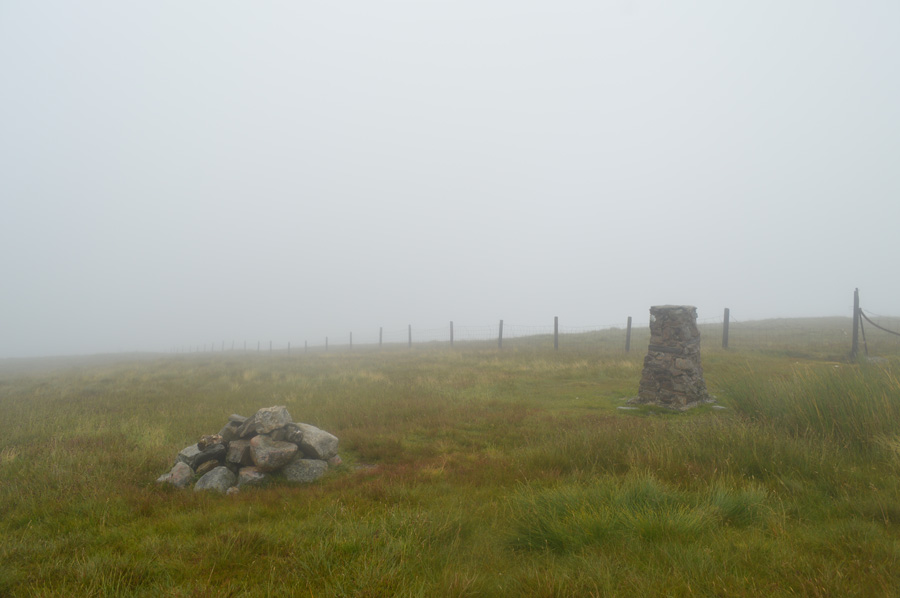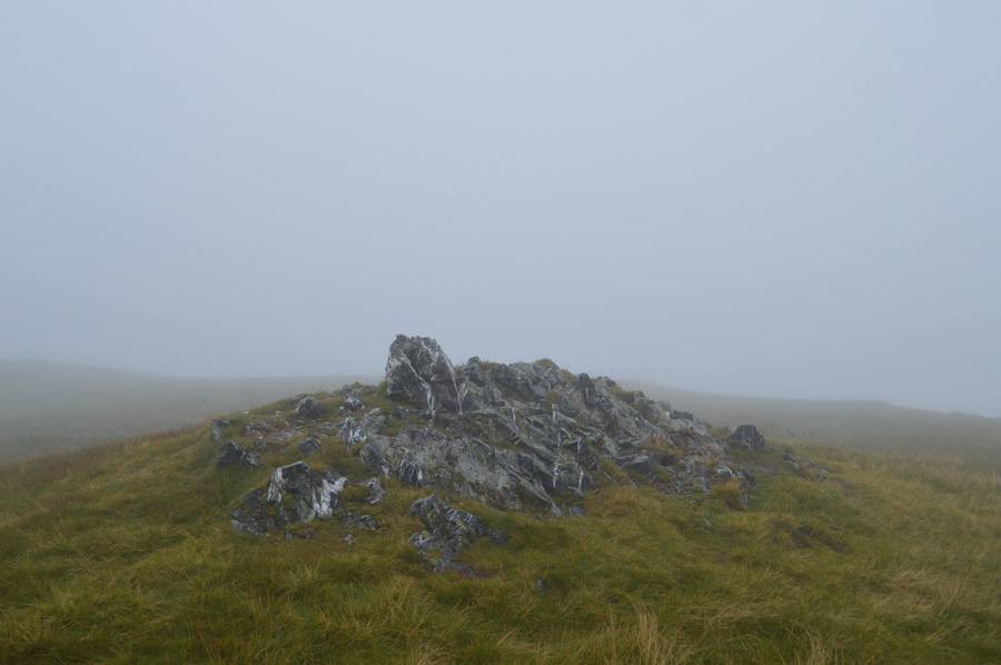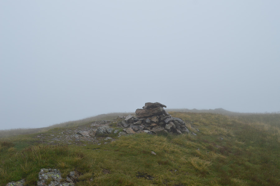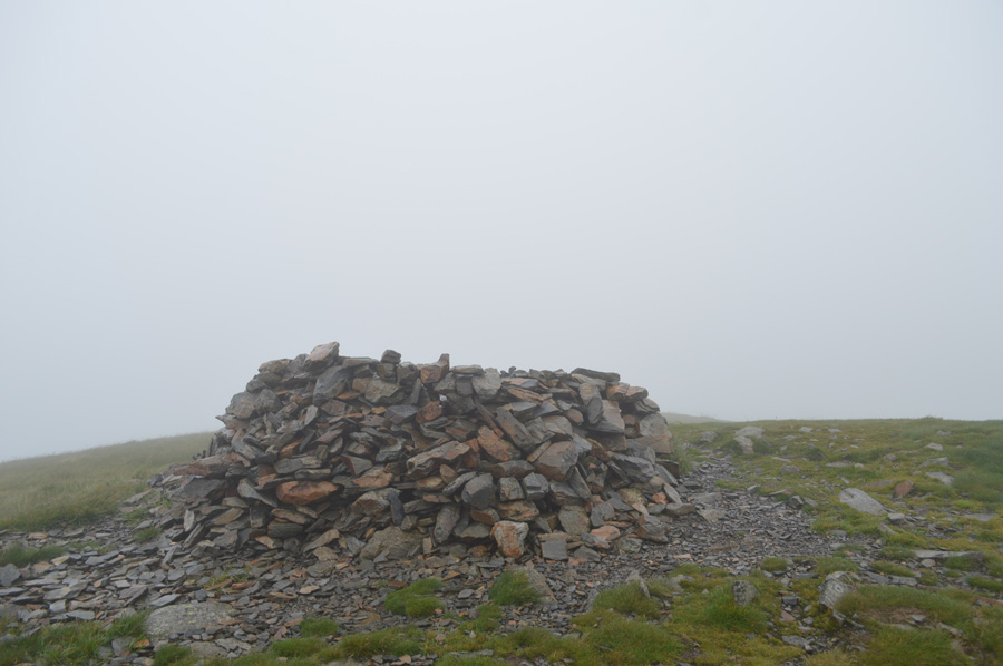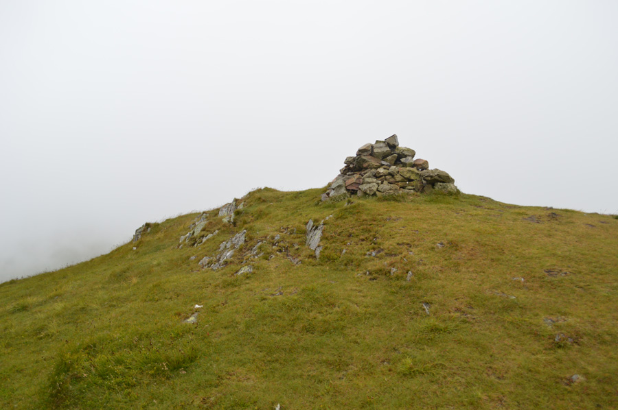From the top of Big Gully we could almost feel the north summit cairn just ahead it was just the strange fact that we couldn't see ten feet in front of our noses but we soon arrived at a large cairn at the end of the path and headed towards Mellbreak north top summit cairn at 509' This indeed is not the true summit of Mellbreak which is found just under a mile away at the south top just three meters higher at 512'