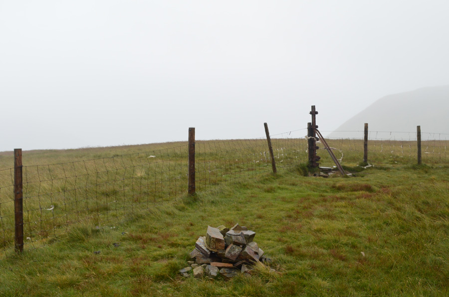 | With the descent of Hen Comb behind we pass over a wooden sty and start to make the slight ascent over Whiteoak Moss, The grassy knoll that is Floutern Cop is out there somewhere dead ahead but all we could see was a wall of cloud although for a few moments it did stop raining enabling me to fold back my hood, not before giving it a good shake that is, I'm now able to listen to the wind as it howls through the wild grasses and incredibly we spot a group of thirteen walkers heading through the upper Mosedale Valley somewhere in between Hen Comb and Mellbreak, at least I thought, we had height as an advantage despite the swell beneath our feet, down there at valley level I can only imagine it's pretty grim underfoot, but it was still nice to see we weren't the only ones out on the fells today. |