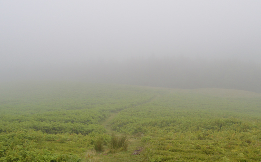 | After passing Floutern Cop to our right we follow a narrow path which eventually would descend towards Ennerdale, instead we tramp onwards towards a wooden gate where we trace a sharp right followed by a sharp left and another right in line with the wire fence which descends across the top of Grain Gill from where the path steadily rises towards Gavel Fell summit. It hadn't rained for the last twenty minutes or so and we were still being treated to sudden gaps in the cloud every now and again which raised hopes that maybe, just maybe the cloud might lift but this never materialised, in fact the cloud came back down and the light faded but before it did we did manage to see quite a vista between the summits and the low cloud leaving me feeling like a sandwich filler. |