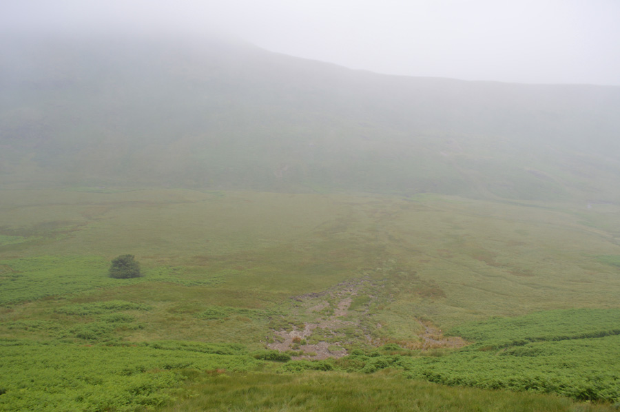 We walked south for a short while headlong into the rain before starting our steep descent into Mosedale, the hill fog was still thick and with no real view we kept with our steep descent until the Mosedale Holly Tree came into view, not bad we thought for a guess on our location but our descent wasn't as simple as first thought as quite a bit of wet Bracken had to be blazed through first but soon options opened out over grass and through Heather.
