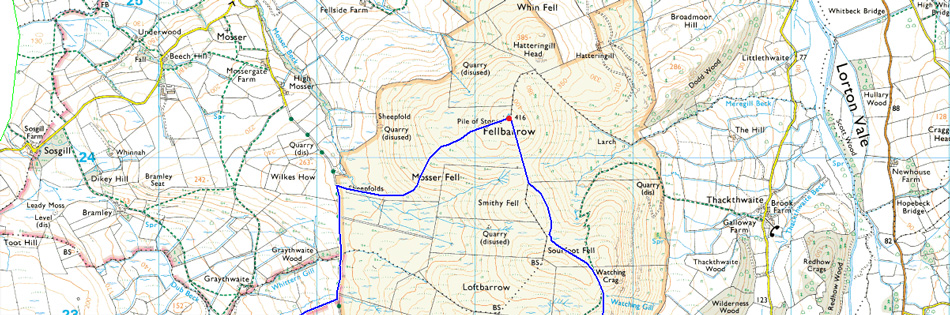 From the summit we tramp in a easterly direction and slowly began our descent first across the summit plateau before following the steep path on the northern flank of the fell which overlooked a distant Fangs Brow where morale was boosted with talk of our last two summits in Fellbarrow and Low Fell, but before hand we needed to negotiate the lanes and bridleways of Jenkins Place and Hudson Place before arriving on the Mosser Road. |