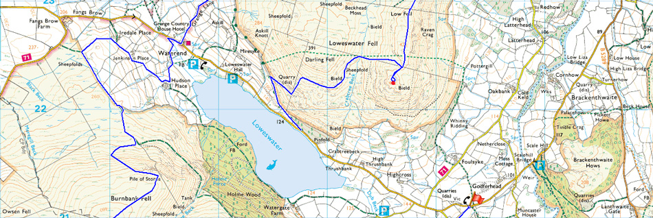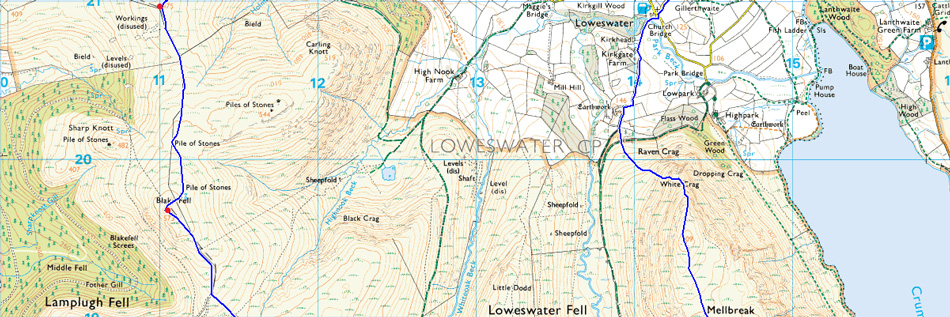 Loweswater - Kirkgate Farm - White Crag - Mellbreak - Mosedale - Mosedale Beck - Hen Comb - White Oak Moss - White Oak - Gavel Fell - Fothergill Head - Blake Fell - Burnbank Fell - Jenkinson Place - Hudson Place - Grange Lane - Mosser Road - Mosser Fell - Fellbarrow - Low Fell - Crabtree Beck - Mosser Road - Loweswater Road