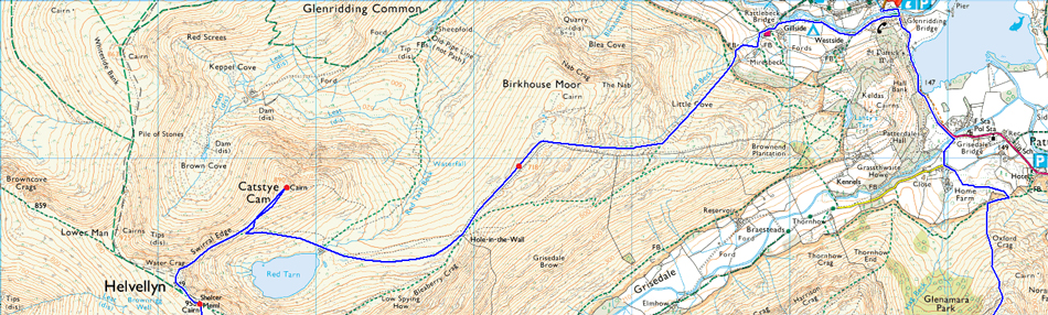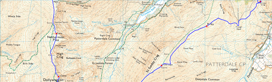 Glenridding – Mires Beck - Birkhouse Moor – Red Tarn - Catstye Cam - Swirral Edge – Helvellyn - Nethermost Pike - High Crag - Dollywaggon Pike - Seat Sandal - Grisedale Hause - Deepdale Hause - St Sunday Crag - Birks - Trough Head - Arnison Crag - Grisedale Bridge – Glenridding |
