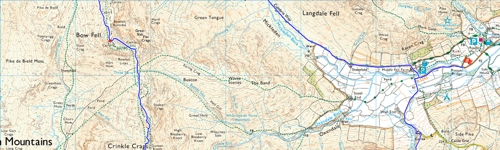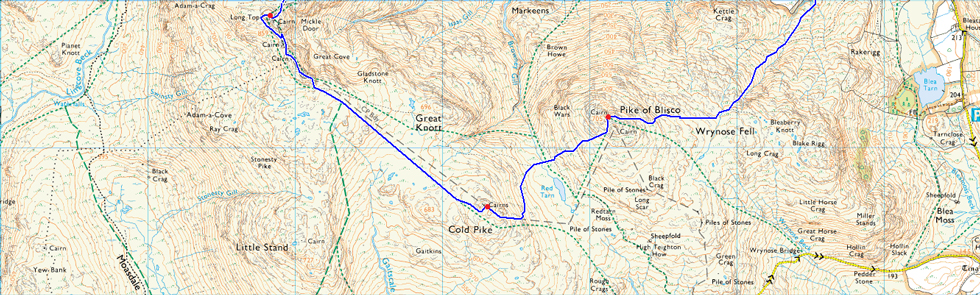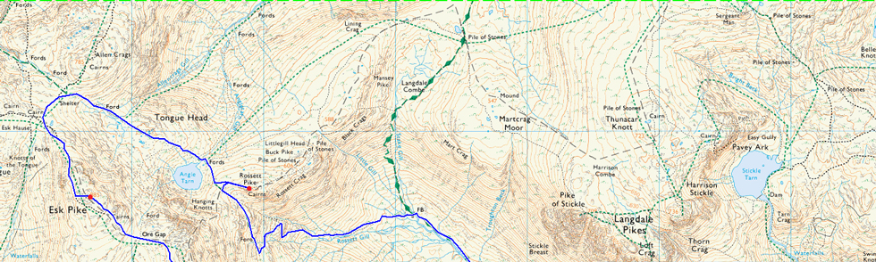 Rossett Bridge - Old Dungeon Ghyll - Mickleden - Cumbrian Way - Rossett Gill - Rossett Pike - Angle Tarn - Esk Hause - Esk Pike - Ore Gap - Bow Fell - Three Tarns - Crinkle Crags - Cold Pike - Red Tarn - Pike O'Blisco - Wrynose Fell - Redacre Gill - Wall End - Old Dungeon Ghyll- Rossett Bridge |