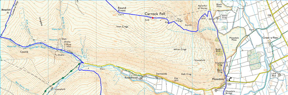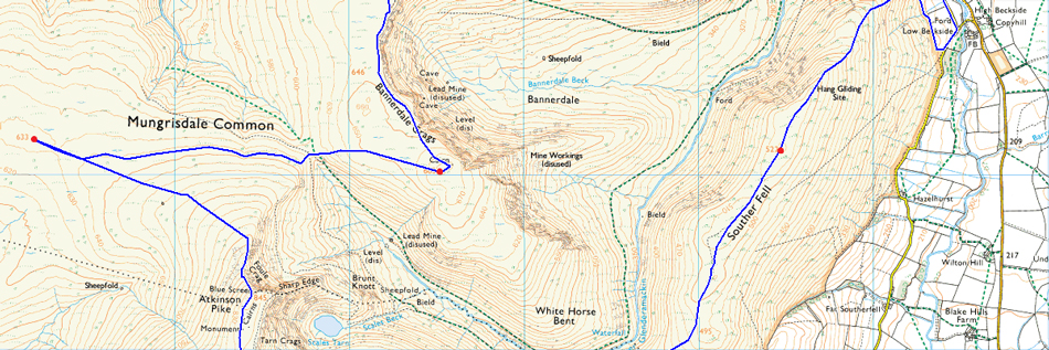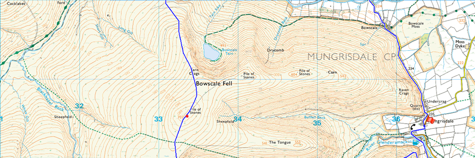 Mungrisdale - Bowscale - Mosedale - Further Gill Syke - Carrock Fell - Miton Hill - High Pike (Caldbeck) - Cumbrian Way - Grainsgill Beck - River Caldew - Bowscale Fell north ridge - Bowscale Fell - Bannerdale Crags - Glederamackin Col - Mungrisdale Common - Blencathra - Scales Fell - Top of Mousthwaite Comb - Souther Fell - Mosedale |