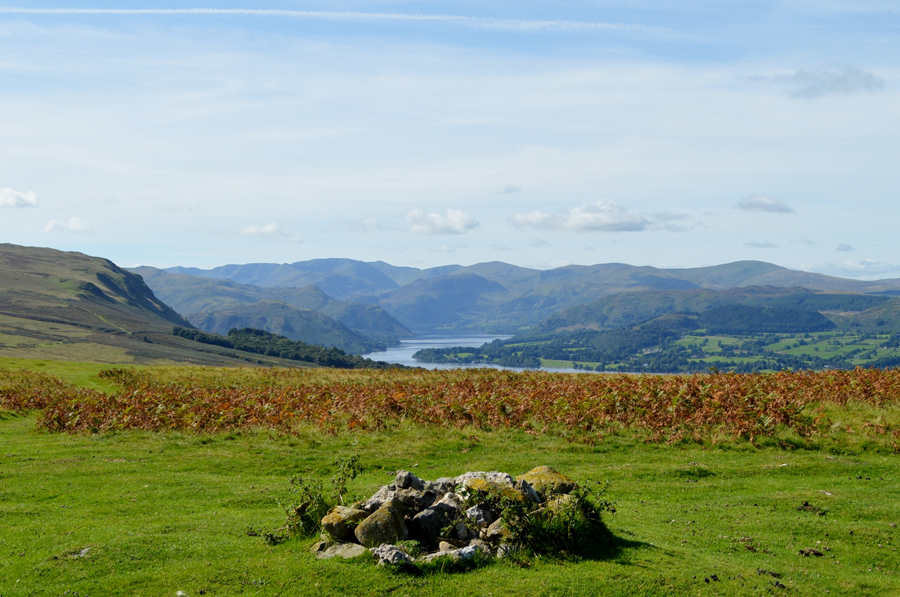 After leaving the Cockpit Stone Circle behind we retrace our route from this morning along the dirt track coming to a stop at two long rows of grass bails which at a guess, are used for animal bedding. Keeping slightly right we start our steady ascent via a wide kept grassy path flanked by retreating Bracken on both sides. Up ahead an elderly couple eat lunch and we could only look on with envy at their chosen lunch spot. At the summit cairn we agree to walk further to Heugh Scar, an escarpment of Limestone sittuated on the northerly edge of the summit where we would have equal views almost the length of Ullswater. |