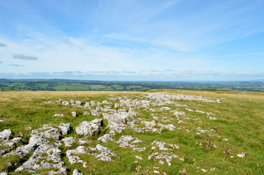 We followed the grassy summit path after diverting slightly to visit the Limestone Pavement each coming to a stop at three seperate boulders large enough to plonk our backsides down on, our views, striking.