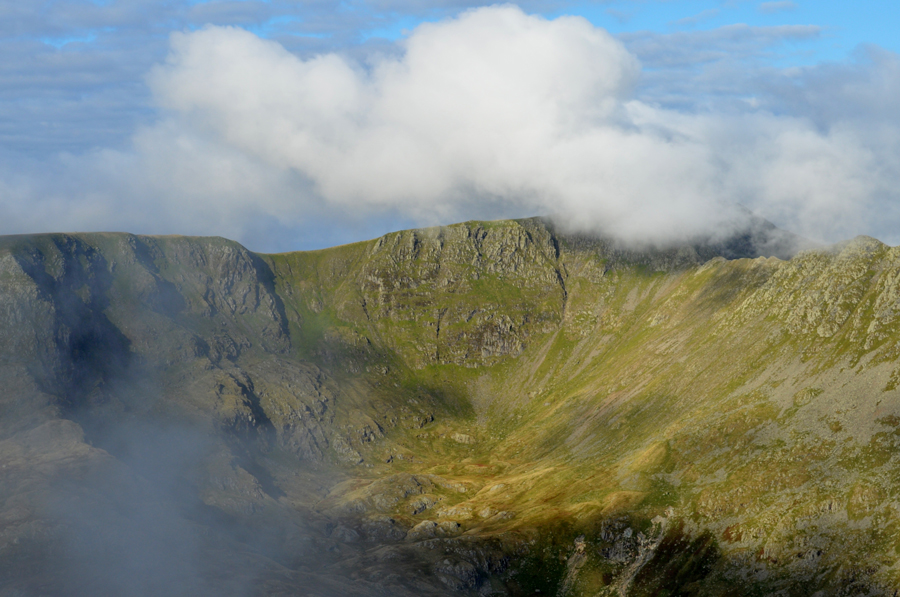 A solitary cloud covers Helvellyn summit with views over Striding Edge, Nethermost Pike and Nethermost Cove. |
