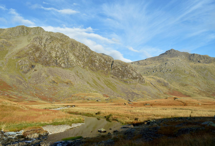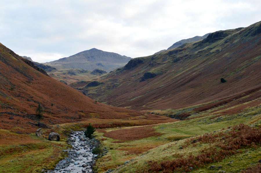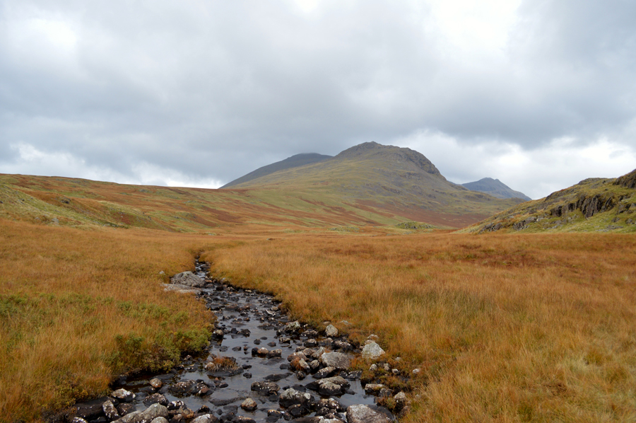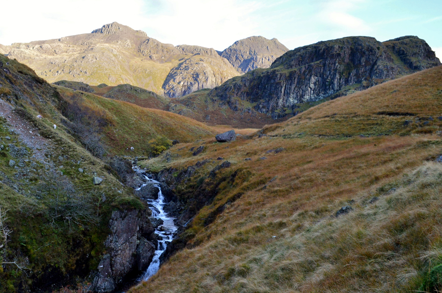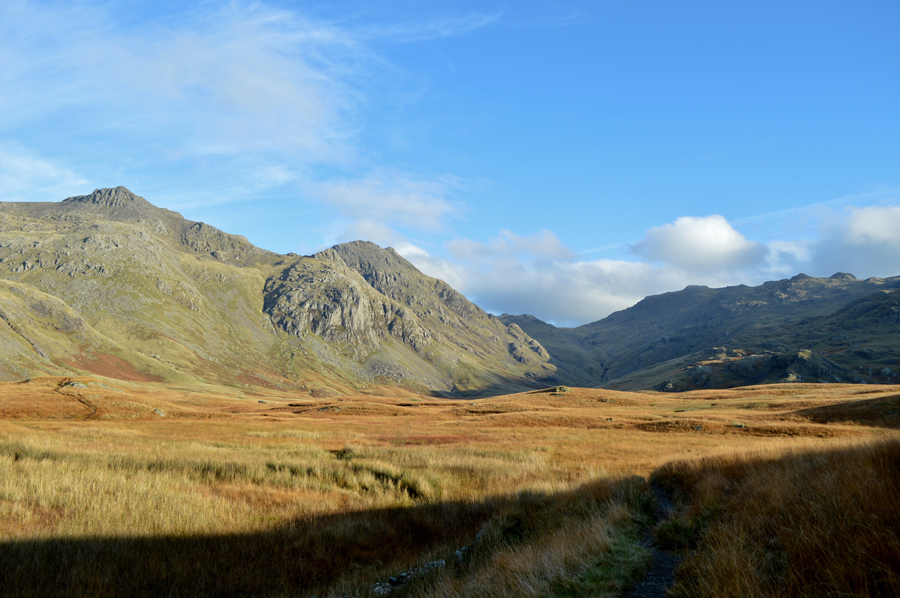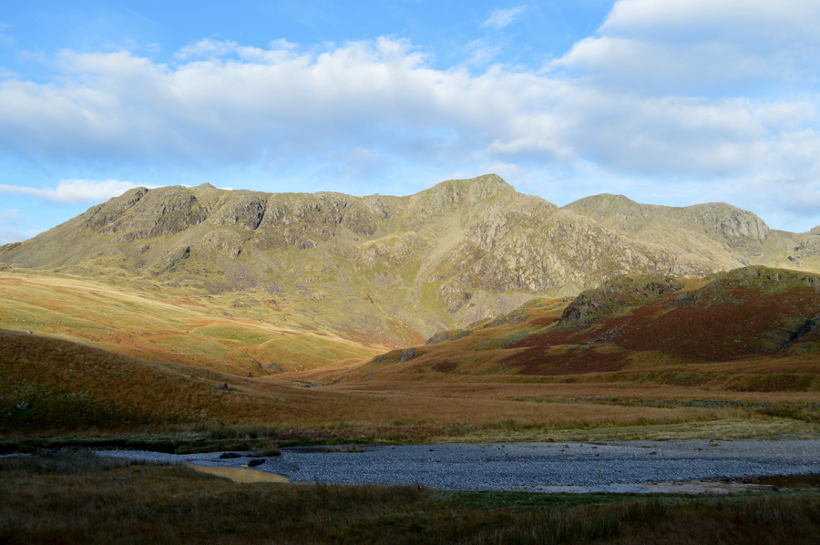 | Bowfell dominates the view as I head towards Lingcove Bridge. |