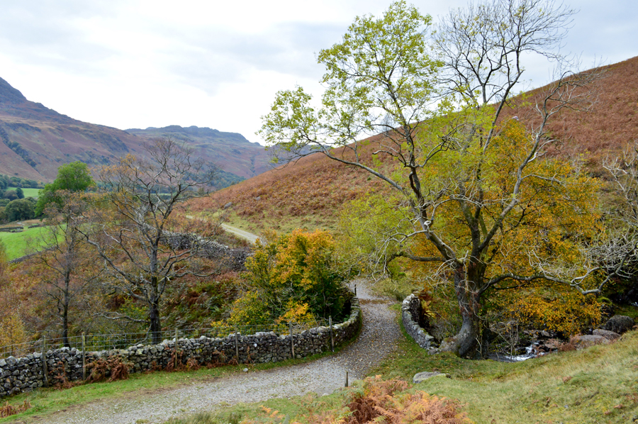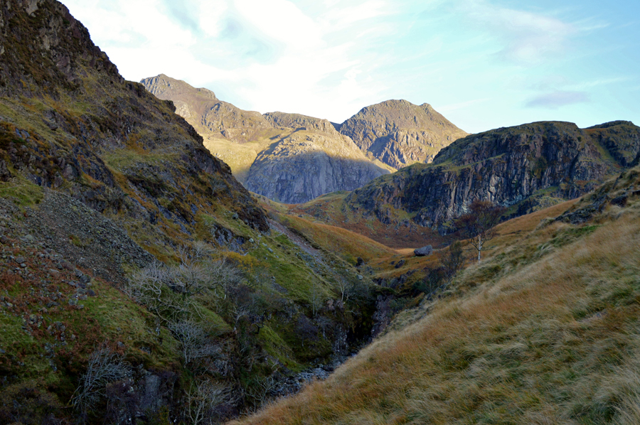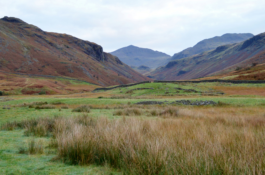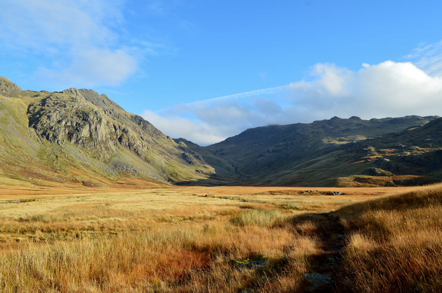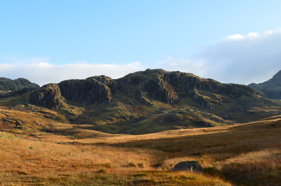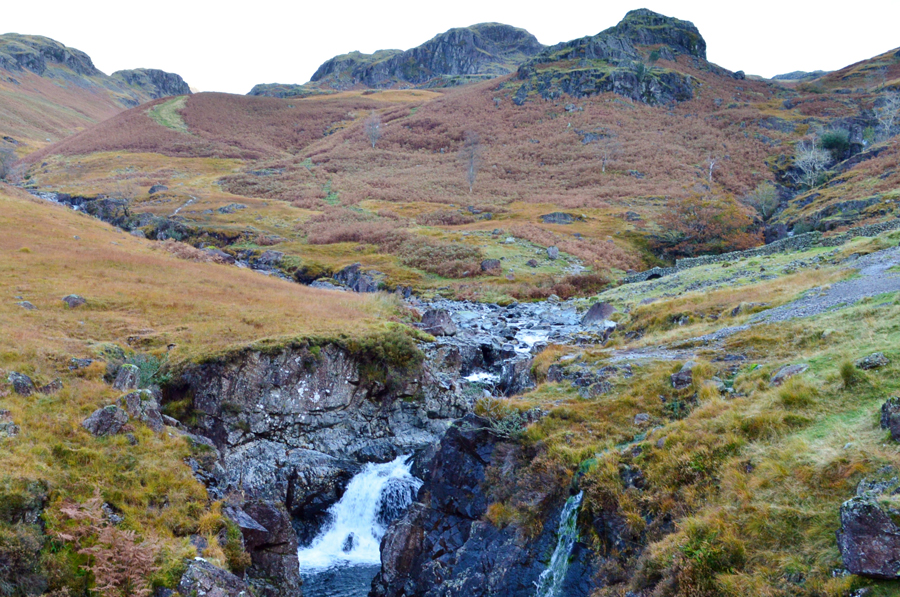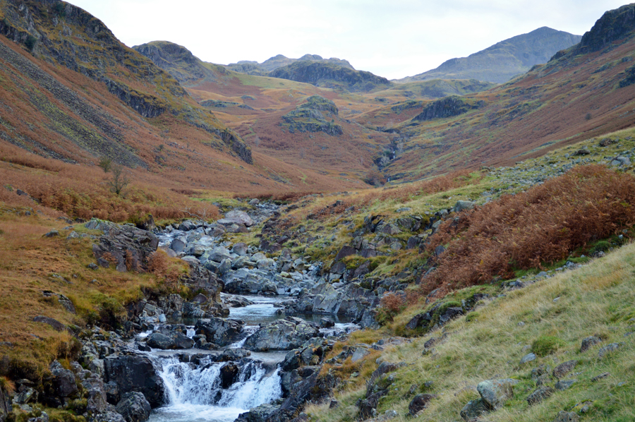 | Bowfell dominates the view as I head towards Lingcove Bridge. |