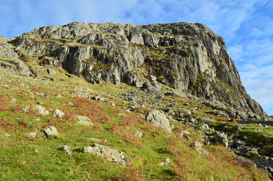 | The lure of a summit of Pen was just too much and beneath its Buttress I started the excessively steep climb along the course of a prominent grassy path. Soon however, my eye is averted to an alternative 'shelf like' route that I had seen during my ascent which can be seen to the right, after figuring that this route looked manageable I changed course and made for the base of the Buttress. |