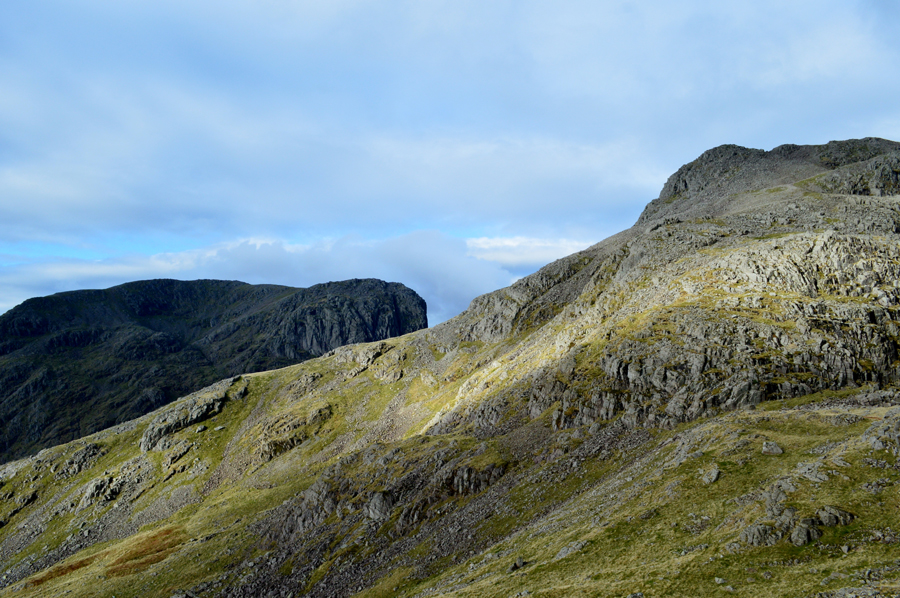 | Scafell Pike is just up ahead while Broad Stand and Scafell is seen over on the left now in shadow. |