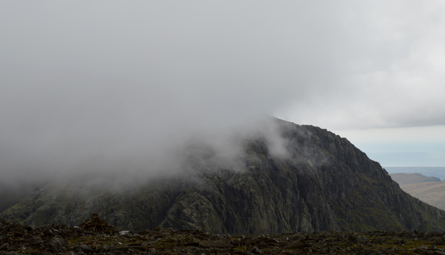 | Despite how beautiful the light was, the advancing cloud that I had spoke of ealier may have a major effect on todays plans, and because of this my break was shortened and I left the summit of Pen with the cloud trailing in from behind. |