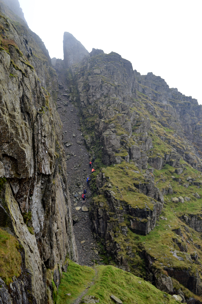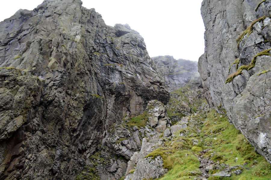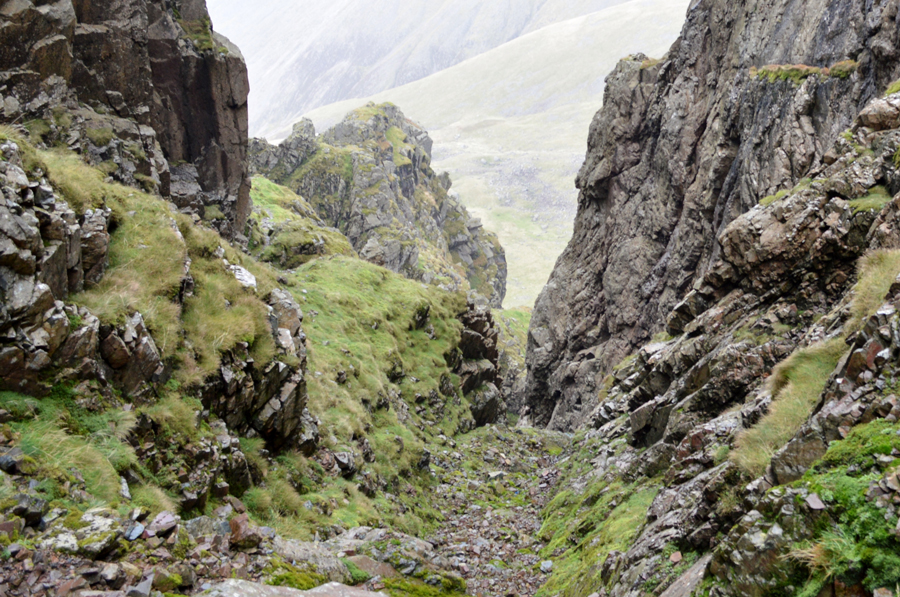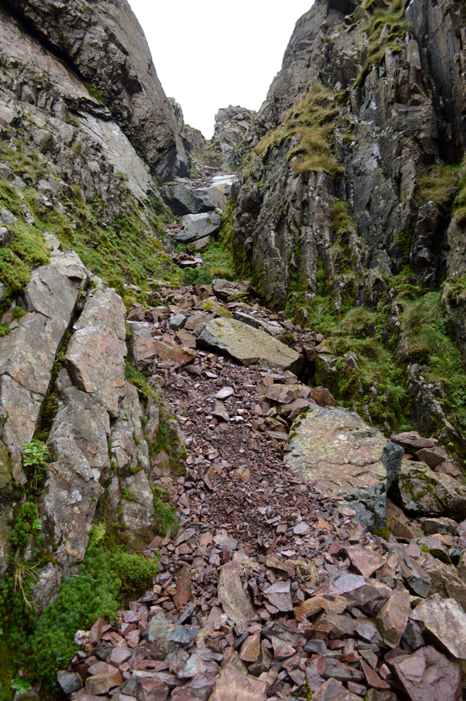 The rain continued and had a slight affect on my ascent leaving the scree a little more vulnerable which left me trusting my footings in certain places. Up head the group had stopped to have a look around where the Chock Stone had fallen and soon they were on their way by the time I reached the same spot.
