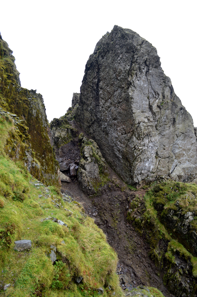 It is clear through the sheer weight of the Chock Stone that for now it isn't going anywhere, only embedding itself deeper into the scree but I certainly wouldn't like to rule out any more movement. On reaching the slab of rock it is obvious that you have to go around it and I found where it now lies is quite a steep section of the rake where firm footings are sparce, an indication of which was when I tried to take a photo once past the slab as my legs started to wobble and feel like jelly, it just paid to keep moving.