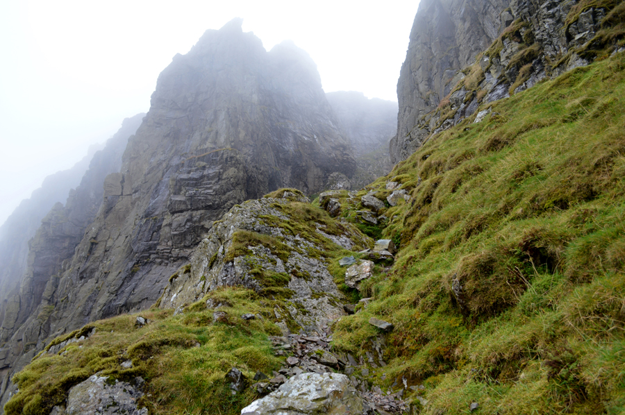 | From the start of the traverse I pick up a prominent shelf like path which rises steeply into the mountain, there are simply no other words to describe this other than listening to ones heart beat as it palpitates inside your chest. |