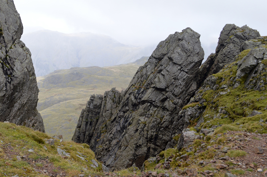 | Thostle Garth, Thostlehow Crag and High Gait Crags with Bowfell still domineering the scenery. |
