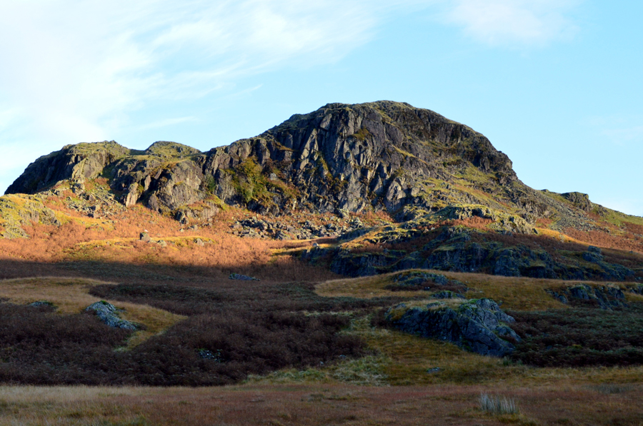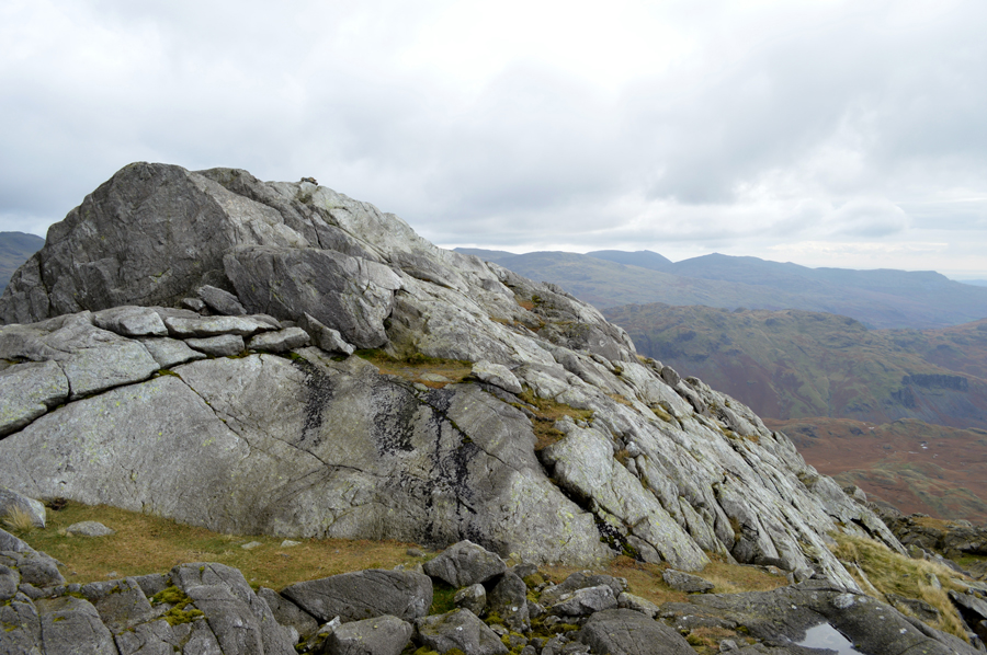 The low light had ever so slightly started to lift revealing the Autumnal colours of the wild grasses from Great How in the south to IIIgill Head towards the west. I arrived at Slight Side to find a young couple eating lunch in the rocky nook which separates the summit outcrops. With pleasantries passed I made my way towards the summit clambering over dry rock until I was able to touch the summit cairn before lowering myself down just shy of the summit cairn where I decided to break out lunch.