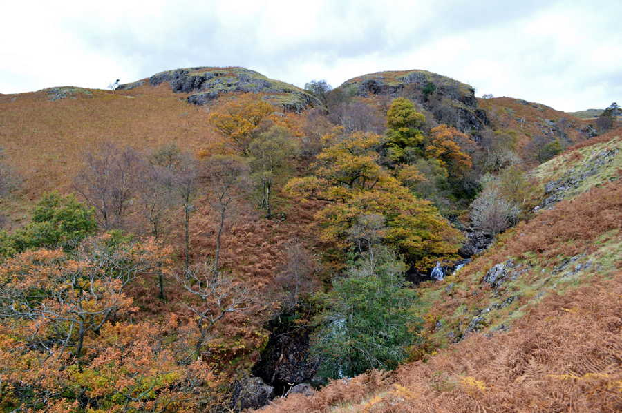My route into Great Moss via the flank of Thostlehow Crag can now be seen as the grassy path over on the left. This is where the River Esk flows through Esk Gorge via a series of dramatic waterfalls as too does Lingcove Beck whose course can seen if you follow the tree line over in the right of the photo.