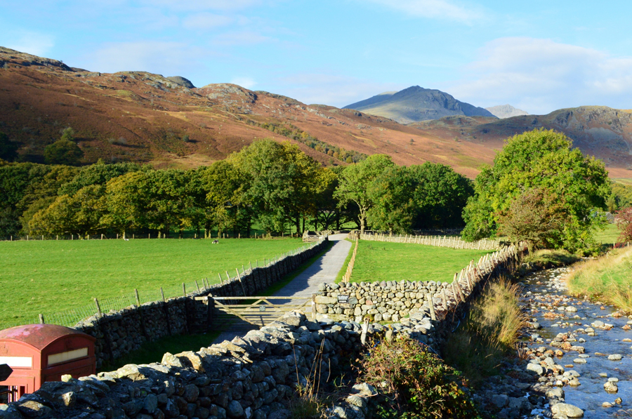 After cautiously passing over the cattle grid myself (I hate walking over cattle grids probably more than cows do!) I pass the familiar red phone box which is missing all of its glass. Up ahead is Brotherilkeld Farm and from the farm track I can see the top of Bowfell and Crinkle Crags, both summits clear and free from cloud, although these summits aren't on todays agenda them being clear was a good sign for surrounding summits, even if I still can't see them. |