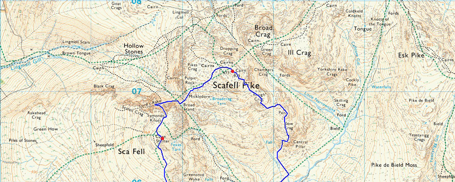 Jubilee Bridge - Brotherilkeld - Lingcove Bridge - River Esk - Pen - Rough Crag - Scafell Pike - Mickledore - Rakes Progress - Lord's Rake - West Wall Traverse - Deep Gill - Symonds Knott - Scafell - Long Green - Slight Side - Catcove Beck - Taw House - Brotherilkeld - Jubilee Bridge |