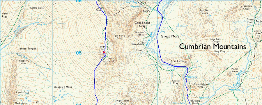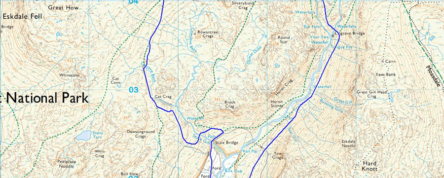Once I had crossed the top of Catcove Gill I consult my map if only to make sure the side of the Gill I need to be on, a path that I had spotted earlier this morning from Brotherilkeld Farm yet it was proving a little more difficult once within its vicinity. I soon find my path and begin the descent via the right of the Gill but I'm drawn to the Gill itself which caused me to abandon my path and cross the Gill where I swill my boots free from mud and alike. Now on the wrong side of the Gill I begin a pathless descent where I consult the map again where it seems I'm not too far from the path which rises above Scale Bridge which is where I head to next. |