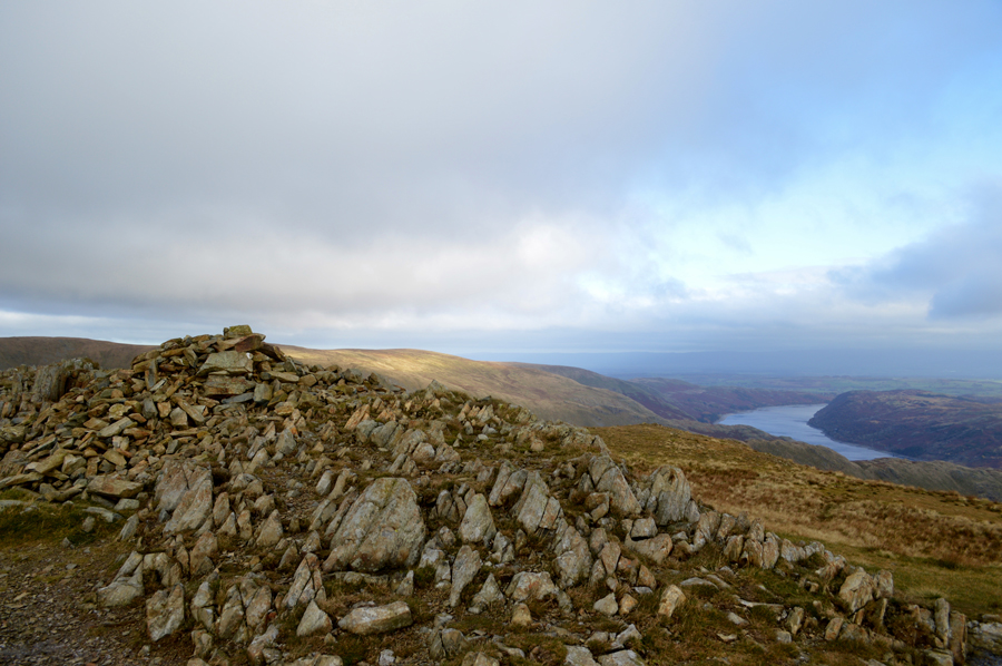 I joined the zig zags on the final approach towards the top of the pass where the wind returned with a vengeance. I had taken the liberty to make sure everything on me fastened down as a whip from a strap on chilled skin isn't very pleasant as I crested towards the shelter I took a few seconds to look down on Mardale Head where I tried to count the cars at the car park which would give me some indication if I'm likely to see anyone else this morning, it was no use though even while wearing sunglasses I could only manage to count three cars although I was certain there was more such the windchill against my face I thought it best to keep moving. |