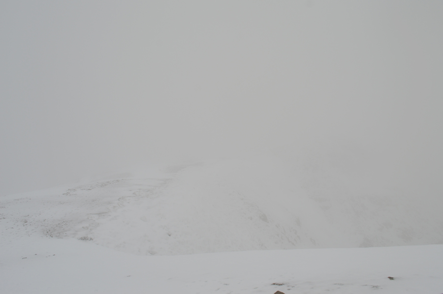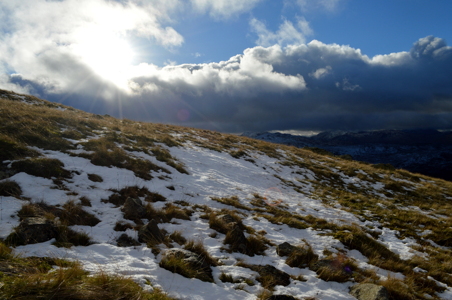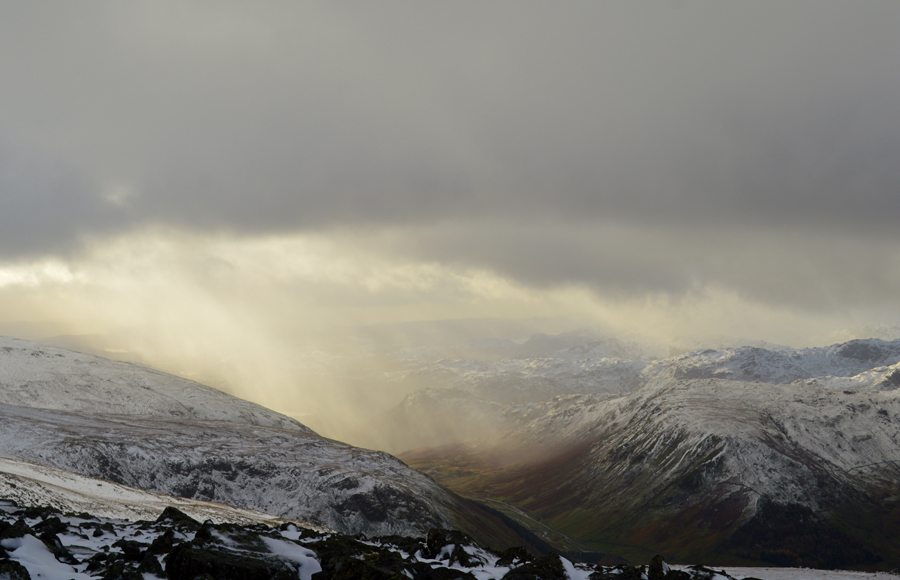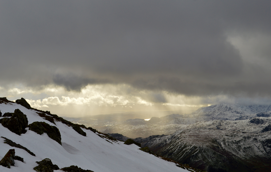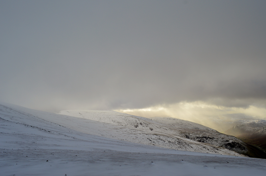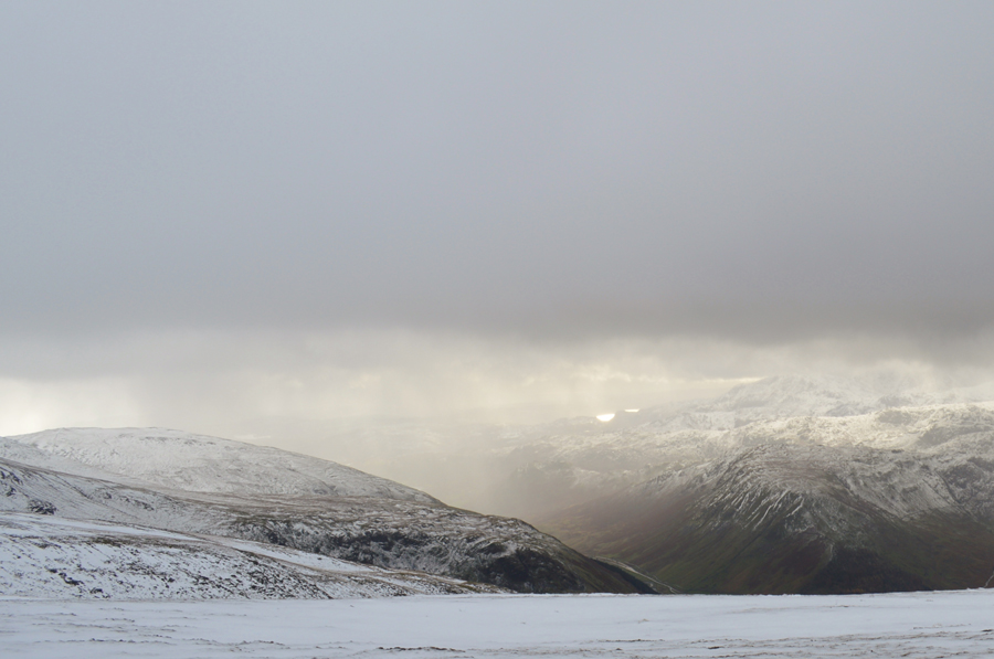The temperature rises within the click of a finger all the while the sun is trying to break through the cloud which illuminates the snow covered fell side. |
